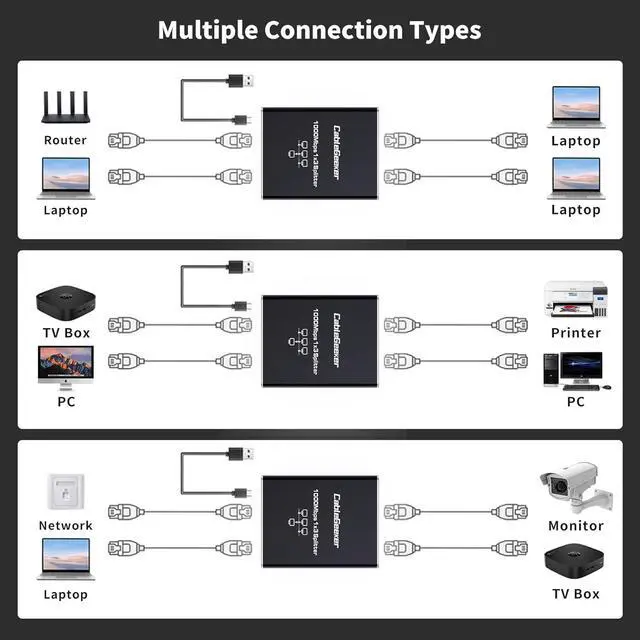 RJ45 Ethernet Splitter 1 to 3: CableGeeker' s splitter solves connection issues from insufficient cabling. Powered by the included USB cable, it supports three devices sharing one Ethernet line simultaneously, offering an ideal connectivity solution