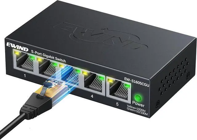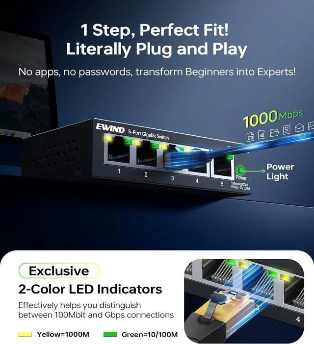 Plug & Play with Dual-Color LEDsThis gigabit switch have instant network expansion with 5 auto-sensing 10/100/1000Mbps ports. This ethernet switch supports Auto MDI/MDIX and IEEE 802.3 az energy-efficient standards. No configuration neededjust plug in for instant gigabit networking. Also, the 5 port network switch have exclusive dual-color LED design lets you quickly distinguish 100Mbps/Gbps port statuseseven beginners can manage like pros.