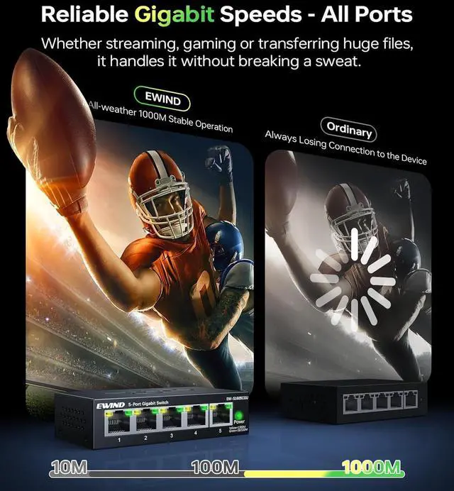 Trustworthy Gigabit High-Speed SwitchFeaturing a military-grade chipset and double-shielded anti-interference circuitry, this network switch has undergone 50+ rigorous engineering testsincluding 8, 000+ hours of full-load stress testing and 4, 000+ RJ45 port plug/unplug cycles, etc. Its stability, durability, and safety perform NO. 1 among all switch, maintaining like-new performance for 7+ years. Instantly upgrade to 1Gbps without Cat6 wiringcuts installation costs & hassle by 60%!