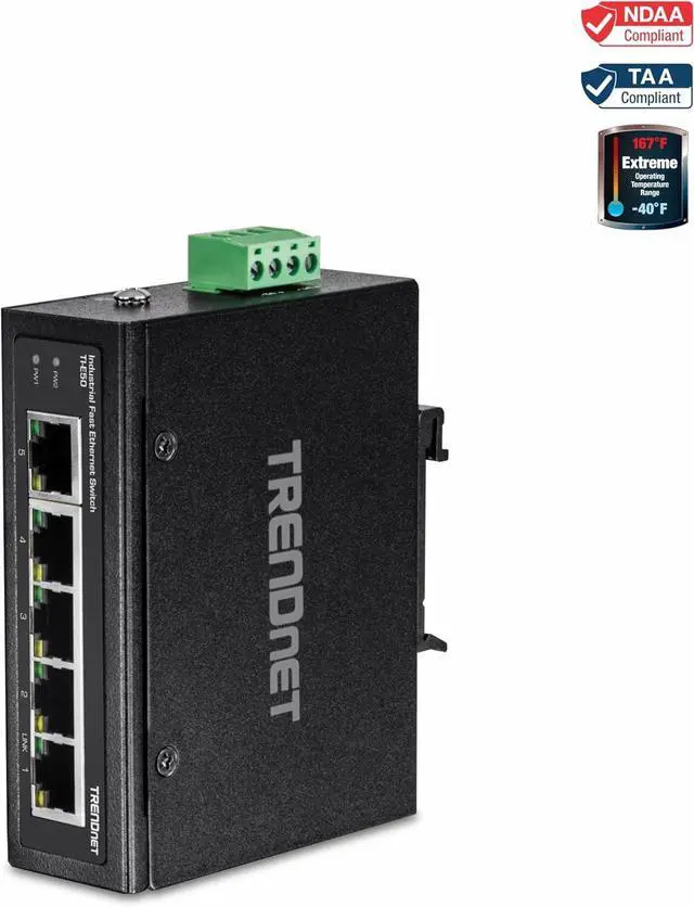 TRENDnet 5-Port Industrial Fast Ethernet DIN-Rail Switch, TI-E50, 5 x Fast Ethernet Ports, IP50 Rated, Extreme Temperature Operating Range, 1Gbps Switching Capacity, Lifetime Protection