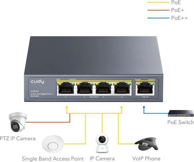 Four PoE ports with Giagbit output: IEEE 802.3 at / af compatible, support for providing PoE power up to 30 watts per port. Auto-sensing technology conveniently delivers the right power required to power your PoE or PoE+ device.