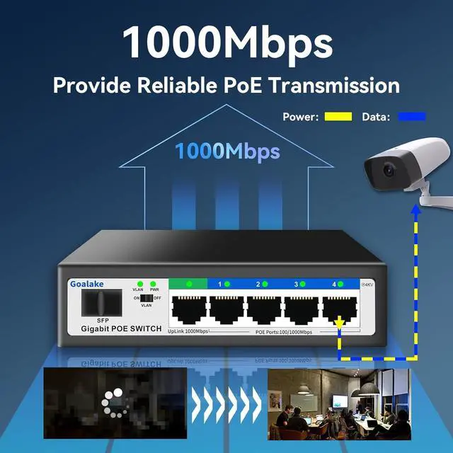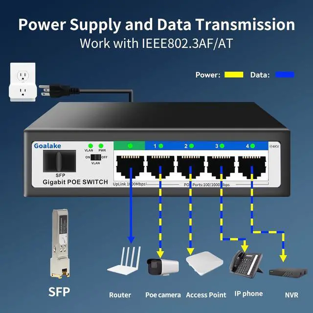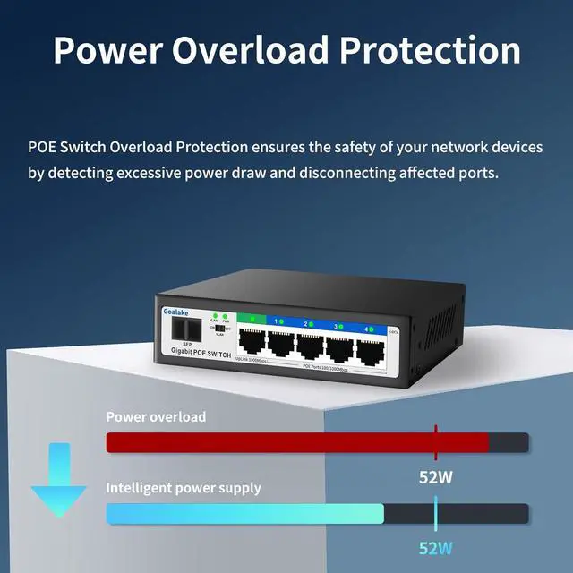 Port Gigabit Poe Switch: Goalake gigabit poe switch includes 4 port gigabit switch + 1 gigabit uplink +1 x 1.25G SFP. Compliant with IEEE 802.3 af/at standard, it can deliver up to 30W for each PoE port. Data, and power can be transferred on one single cable. It supports PoE power up to 52W for all PoE ports.