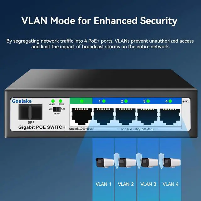Active poe switch with VLAN: Our 4 port gigabit switch features VLAN mode, allowing you to isolate the 4 PoE+ ports from each other. This simplifies management and maintenance, prevents broadcast storms, avoids data confusion, and ensures a more stable wireless networking experience.