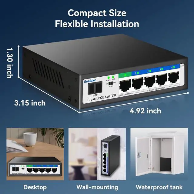 Enhanced Power and Flexibility: Experience the superior power and flexibility of Goalake PoE switches with POE+. Enjoy cost savings and simplified installations with plug-and-play functionality, making it easier to set up IP cameras and wireless access points. You can mount the ethernet switch on the wall or desktop, perfect solution for home office and a variety of environments.