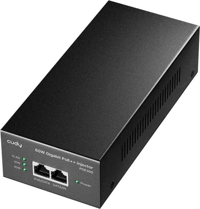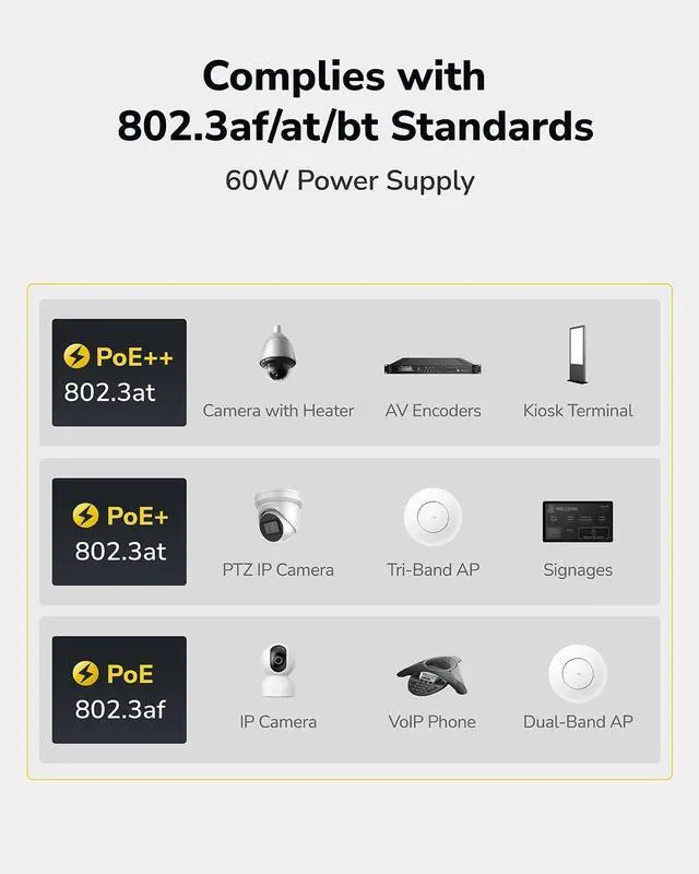 Auto-sensing technology delivers up to 802.3 at 60W to a PoE+ device with backwards compatibility for 802.3 at (30w) and 802.3 af PoE ( 15.4W ) devices. Not support 802.3 bt/PoE++ or any passive PoE devices.