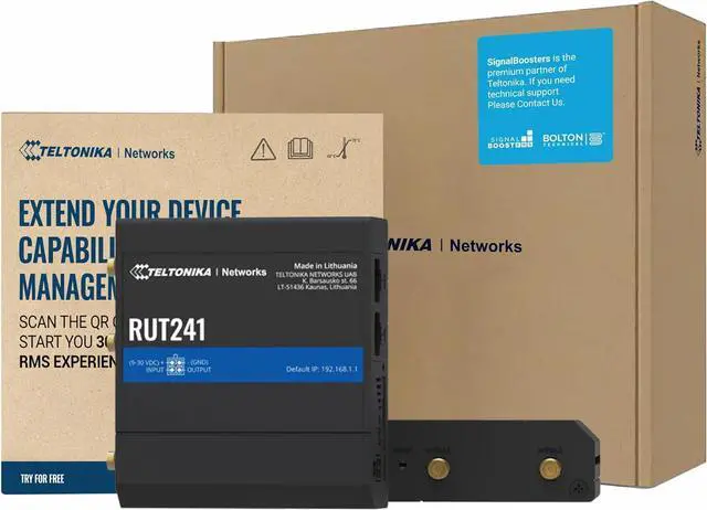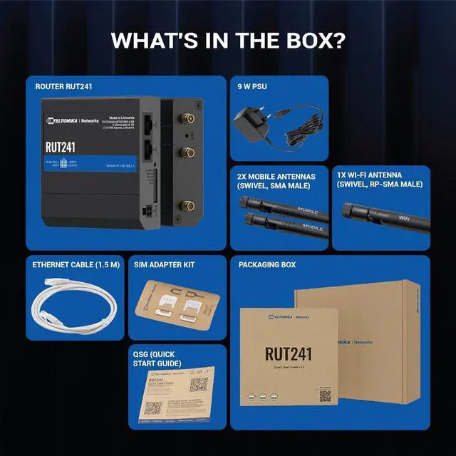 Package Included Accessories: Complete your setup with this all-inclusive package featuring the router WiFi RUT241. Includes essentials like a 9 W PSU, 2 LTE antennas (swivel, SMA male), 1 Wi-Fi antenna (swivel, RP-SMA male), Ethernet cable (1.5 m), SIM Adapter kit, and QSG (Quick Start Guide). Ideal for setting up your network with all necessary components in one convenient package.