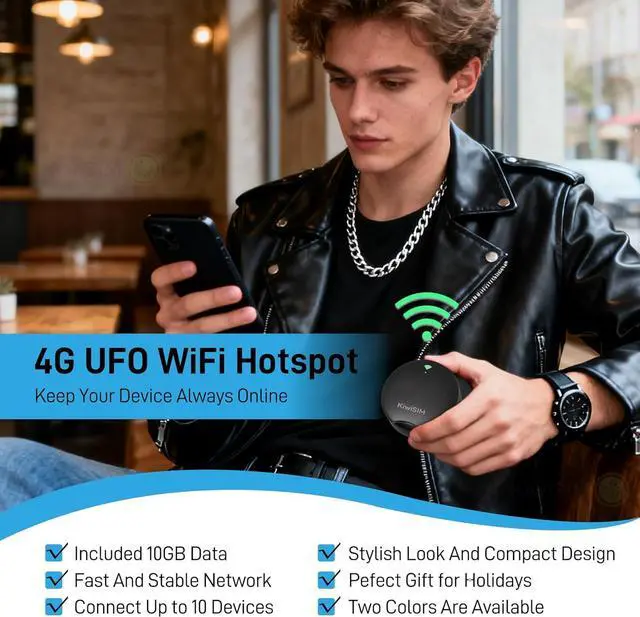 KiwiSIM portable mobile hotspotsupports AT&T, Verizon, and T-Mobile Supports simultaneous connection of 10 devices Network signal covers the United States Two colors and four models available for selection WiFi 6 provides high-speed internet service Supports 10 devices Supports use in the UAS Mini UFO Mobile Hotspot Pink & Black Hotspot Device An Interesting Holiday Gift KiwiSIM 4G UFO Mobile Hotspot WiFi