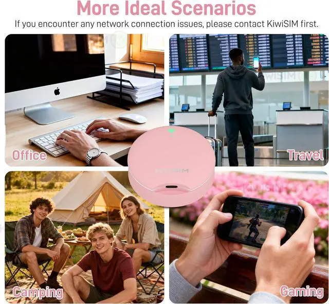 Small and Light: The portable WiFi is compact and lightweight, measuring approximately 3.5 inches and weighing just 0.28 ouncesaround 1/6 the weight of an iPhone. Featuring an ultra-portable design and supporting on-the-go charging, it can keep you connected anytime simply by plugging it into a power base, power bank, wall charger, or car charger. The KiwiSIM Hotspot WiFi is ideal for long-distance trips, RV travels, remote work, and leisure activities.