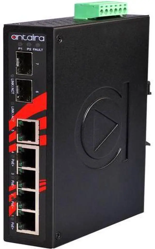 Antaira LNP-0702C-SFP-T - 7-Port Industrial PoE+ Unmanaged Ethernet Switch, with 4*10/100Tx (30W/Port), 1*10/100Tx, and 2*100/10
