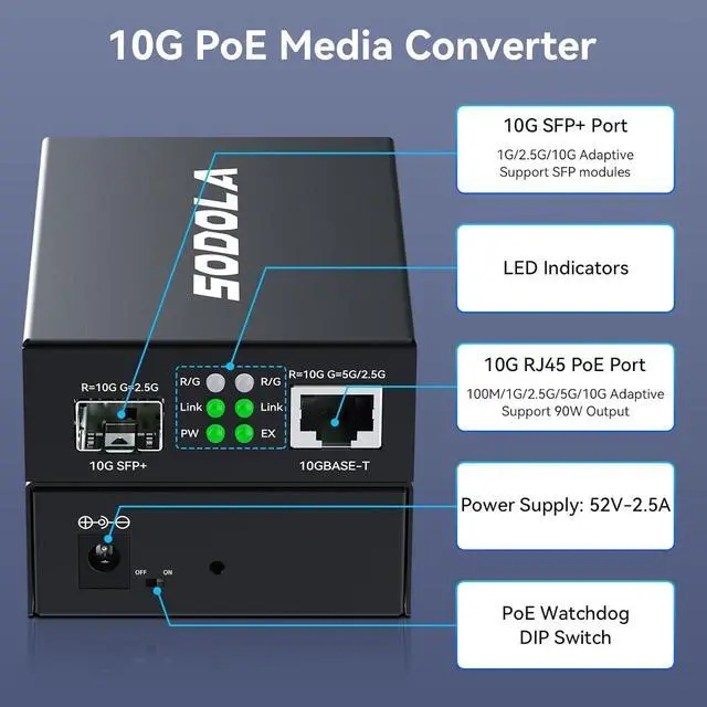 90W PoE++ 10G PoE Media ConverterFront panel: 10G SFP+ fiber port + 10G RJ45 PoE++ port (IEEE 802.3af/at, 90W max). Extend copper/fiber networks and power remote devices (APs, cameras) via single cable. CRITICAL: Requires SFP+ modules at BOTH ENDS (SFP Modules NOT Included IN THE PACKAGE).