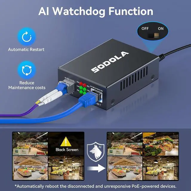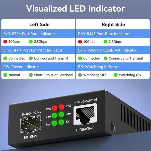 PoE Watchdog Auto-ProtectionThis 10GbE Ethernet PoE Transceiver features an intelligent PoE watchdog that instantly cuts power to the PoE port upon detecting short-circuit, overload, or temperature faults. Safeguards connected devices and the converter itself. Manually reset via PoE Watchdog switch (On/Off).