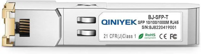 10/100/1000BASE-T SFP to RJ45 Copper Module: Data Rate:10/100/1000M, Interface:RJ45 connector; Reach:up to 100M over CAT.5e Cable Type.
