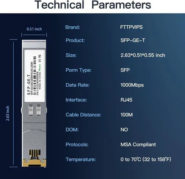 The 10PCS High-Performance 1000Base-T SFP to RJ45 Copper Ethernet Transceiver is built to meet the rigorous demands of Gigabit Ethernet (1000BASE-T) networks. This module ensures maximum equipment compatibility, making it ideal for a variety of networking applications.
