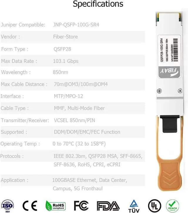 Wide CompatibilityIt's fully compliant and compatible for Juniper networks IEEE 802.3bm 100GBASE-SR4 and CAUI-4 standards, coding as Juniper JNP-QSFP-100G-SR4