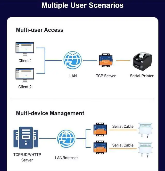 The PUSR TCP232-302-C7 supports multi-client TCP communication with unique registration packets. Devices are easily distinguishable by ID, allowing multiple converters to communicate with a single server efficiently. This makes it ideal for scalable industrial network applications requiring structured data flow and robust connectivity.