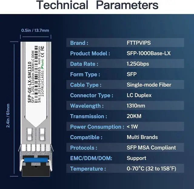 Manufactured by FTTPVIPS, a renowned provider of SFP module transceivers known for exceptional quality and reliability. Enjoy peace of mind with a comprehensive 5-year warranty, lifetime technical support, and a hassle-free 30-day return policy.