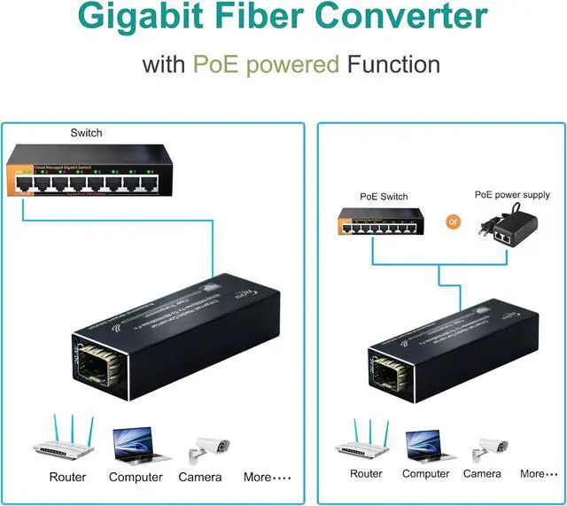 Gigabit SFP Media Converter PoE Powered, 802.3af/at PoE+ in, 10/100/1000BASE-T to 100/1000BASE-X, up to 20km Over Single/Multi Mode Fiber, Auto-Sensing for Security Surveillance, Network Connectivity