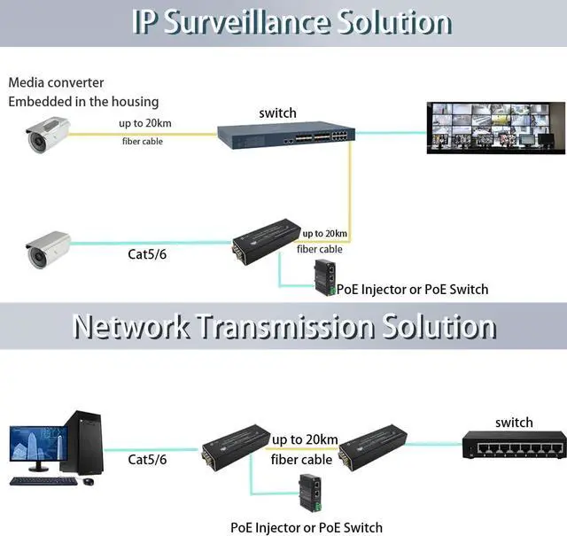 Powered by PoE switch/injector via Ethernet, it converts to fiber (20km) for seamless network extension.