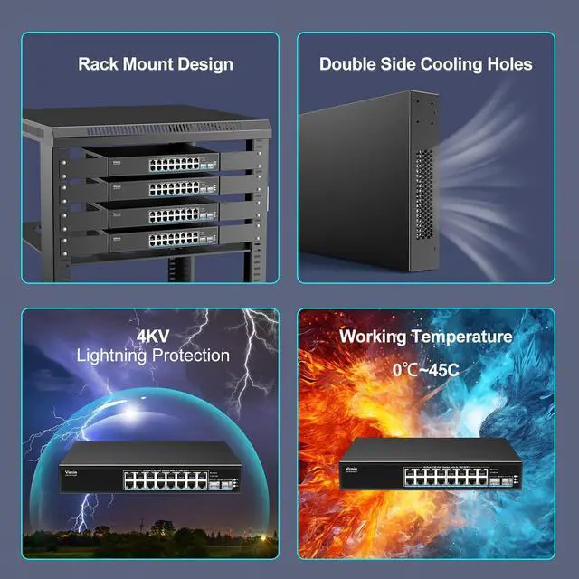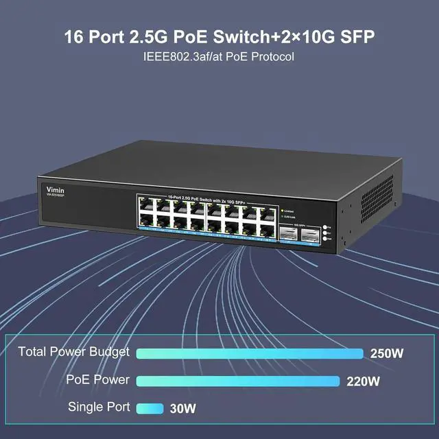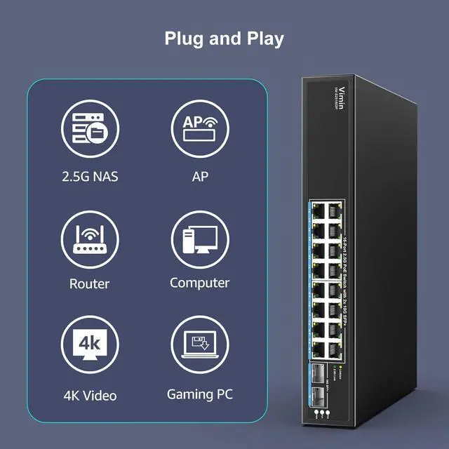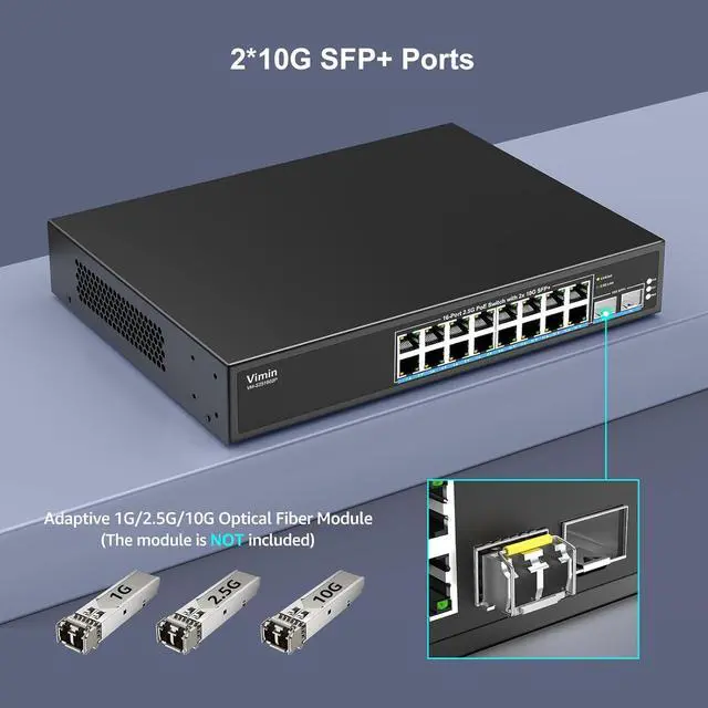 This Item16 Port 2.5G PoE Switch Unmanaged with 2X 10Gbps SFP, VIMIN 16x 2.5G Base-T PoE Ports, 10G SFP PoE Switch w/ 120Gbps Ethernet Switching Capacity, IEEE 802.3 af/at, 250W, VLAN, Metal Housing, FanlessRecommendationsGoodTop 4 Port 2.5G b Unmanaged Ethernet Switch with 2 x 10G SFP+, 4 x 2.5G Base-T Port Compatible with 10/100/1000Mbps, 60Gbps Switching Capacity, Metal Fanless Multi-Gigabit Homelab Setup Network Switch 16 Port 2.5G PoE Switch Unmanaged with 16 Port 2.5G b Base-T PoE+@250W + 2 x 10G SFP+ Uplink, NICGIGA 18 Port 2.5G be IEEE 802.3 af/at Power Over Ethernet Switch, Support WiFi6 AP, NAS, 4K PoE Camera NVR.