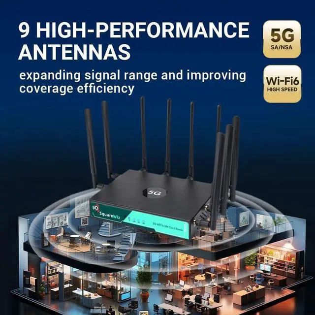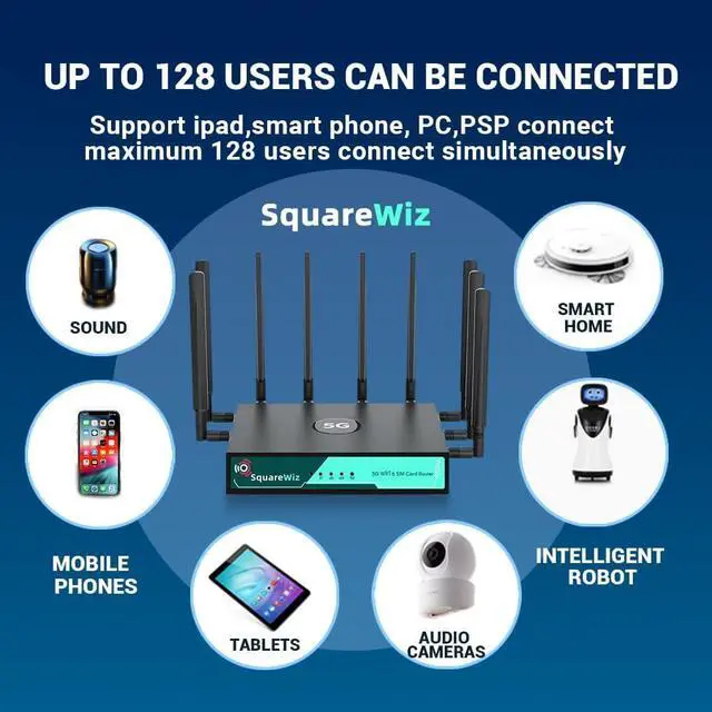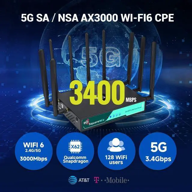This ItemSquareWiz RM520N AX3000 WiFi 6 5G Router with Sim Card Slot,LTE Cellular Gateway with 9 High Gain Detachable Antennas, 5G NR Modem Support 128 Users for Home Office,AT&T T-Mobile Certified,VPNRecommendationsGL.iNet GL-X3000 (Spitz AX) Cellular Gateway 5G Router for House & RV, Wi-Fi 6, Detachable Antennas, Dual-SIM, T-Mobile & AT&T IoT Device Certified, Family/Rural Area/Road Trips (Free 10GB SIM Card) GL-X2000(Spitz Plus) Cellular Gateway 4G LTE Router for Home, RV, Road trips, Offices, CAT 12, Wifi 6 Router, Detachable Antennas, Dual-SIM, T-Mobile & AT&T IoT Certified, OpenVPN, WireGuard (NA Only) Cudy AC1200 Dual Band Unlocked 4G LTE Modem Router with SIM Card Slot, 1200Mbps Mesh WiFi, 5dBi High Gain Antennas, DDNS, VPN, Cloudflare, LT500 Cudy New 5G NR SA NSA AX3000 WiFi 6 CPE Router, AX3000 Dual SIM 5G Cellular Router, Qualcomm IPQ5018, SDX62, 4 x 4 MIMO, Detachable Antennas, Band Lock, VPN, Zerotier, Cloudflare, P5 Yeacomm 5G NR SA/NSA Outdoor Router, 5G Modem Outdoor IP67 Waterproof CPE with Dual Sim Card Slots Gateway/Bridge/Wireless,4.67 Gbps Data Rates,4 X 4 MIMO,802.3af POE,Band Lock,VPN,for North America