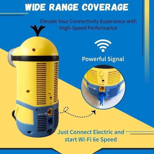 Enhanced Speed : Experience blazing Wi-Fi 6E speed with a straightforward setup just connect to electricity! The Minions KEVIN Router guarantees exceptional performance at a competitive price, making it a hassle-free upgrade.