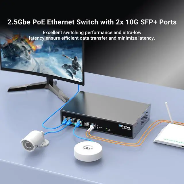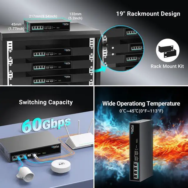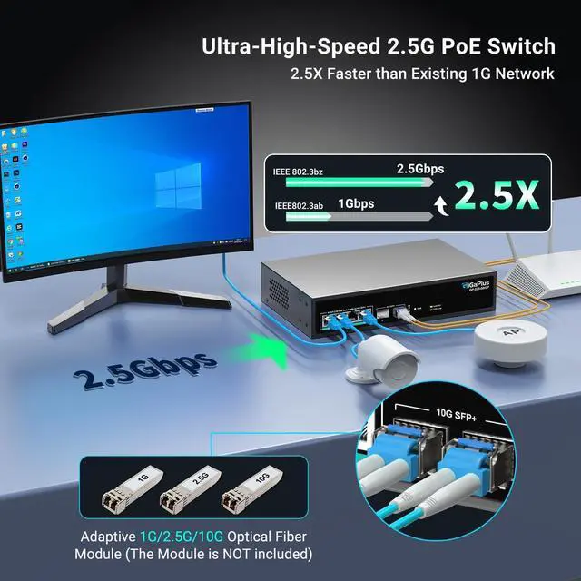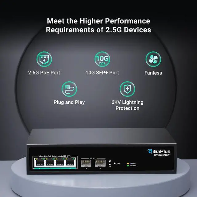 This Item6 Port 2.5Gb Unmanaged PoE Switch with 4*2.5G Base-T PoE Ports, 2*10G SFP+ Uplink, 802.3af/at (PoE+), 60Gbps Switching Capacity, GigaPlus 2.5G PoE Switch for 2.5Gb NAS/PC, WiFi6 Router, Wireless APRecommendations16 Port 2.5G PoE Switch Unmanaged with 2X 10Gbps SFP, VIMIN 16x 2.5G Base-T PoE Ports, 10G SFP PoE Switch w/ 120Gbps Ethernet Switching Capacity, IEEE802.3af/at, 250W, VLAN, Metal Housing, Fanless 10 Port 2.5Gb Unmanaged PoE Switch with 8*2.5G Base-T PoE Ports, 2*10G SFP+ Uplink, 802.3af/at (PoE+), 80Gbps Switching Capacity, GigaPlus 2.5G PoE Switch for 2.5Gb NAS/PC, WiFi6 Router, Wireless AP 6 Port 2.5G Unmanaged Ethernet Switch, 4 x 2.5G Base-T Ports, 2 x 10G SFP, Compatible with 100/1000/2500Mbps, VLAN, Fanless, Desktop/Wall Mount YuanLey 2.5Gbe Network Switch for Wireless AP, NAS, PC TEROW 8-Port 2.5Gb POE Switch with 1*10Gb SFP Uplink, Featuring 9*2.5G PoE Switch, Base-T POE Ports, IEEE802.3af/at, 120W, Compatible with Gigabit, Metal Fanless,Desktop/Wall Mount, 2.5Gbe Ethernet 6 Port 2.5G Unmanaged Ethernet Switch, 4 x 2.5G Base-T Ports, 2 x 10G SFP+, Compatible with 100/1000/2500Mbps, Metal Fanless, Desktop/Wall Mount NICGIGA 2.5Gbe Network Switch for Wireless AP, NAS, PC