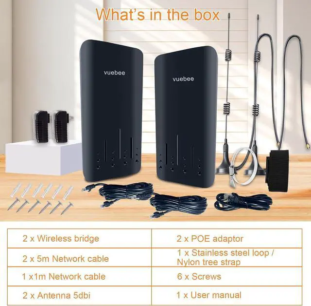 Package Content1 x VB-WFNB01(Transmitter), 1 x VB-WFNB02(Receiver), 2 x PoE Adaptor, 2 x Antenna 5dbi, 2 x 10 m Cable, 1 x 1 m Cable, 1 x lron Hoop / Fabric Strap.