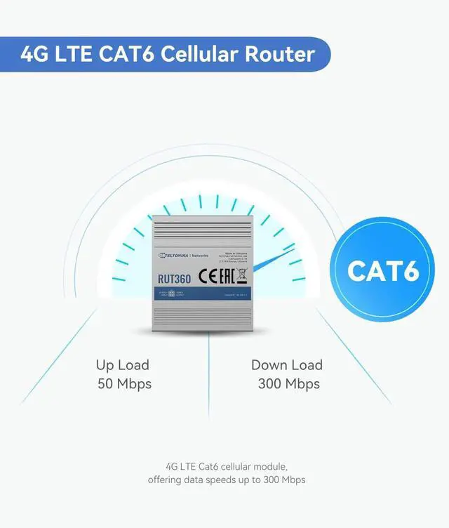 INDUSTRIAL 4G LTE CAT6 ROUTER - Teltonika RUT360 equipped with 2* 10/100Mbps ethernet ports, 802.11 b/g/n WiFi(2x2 MIMO), and 4G LTE Cat 6 cellular module, offering data speeds up to 300 Mbps.