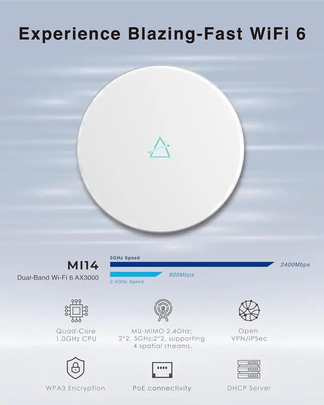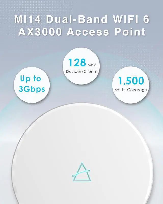 With dual-band 2.4GHz and 5GHz support, MI14 intelligently balances traffic between bands. While the 2.4GHz band ensures wider coverage, the 5GHz band offers faster, less congested performancedelivering smoother, more responsive connectivity for compact business spaces.