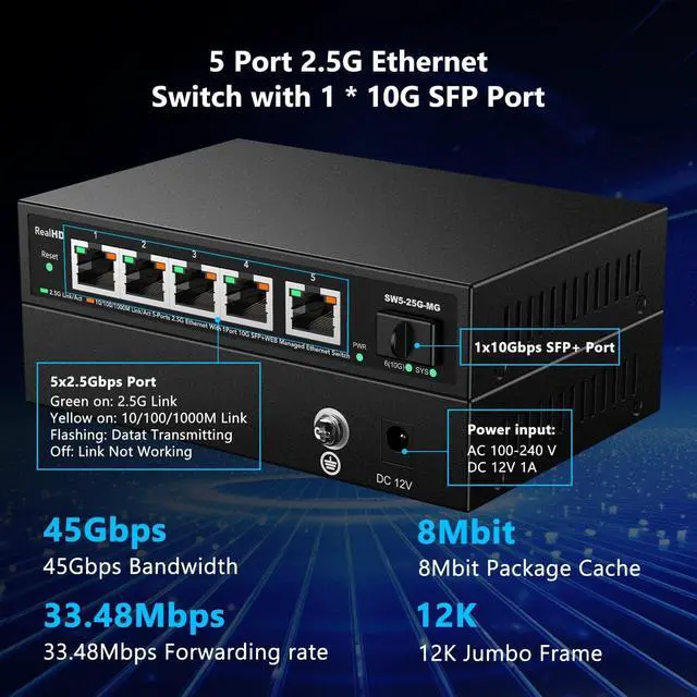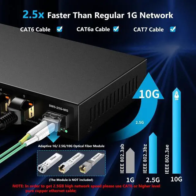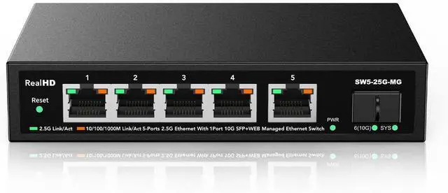 2.5G Super-FastThis 2.5 gigabit switch features 5 x 2.5G RJ45 ports and 1 x 10G SFP+ port, providing higher-speed connectivity for your devices and allowing you to easily upgrade your network to support the latest 2.5G ethernet standard. NOTE: To get 2.5GB high network speed please use CAT6 or higher level pure copper ethernet cable. Please make sure other network products come with 2.5GB network cards to get whole network 2.5GB speed, otherwise the network speed will be determined by the lowest speed network device.