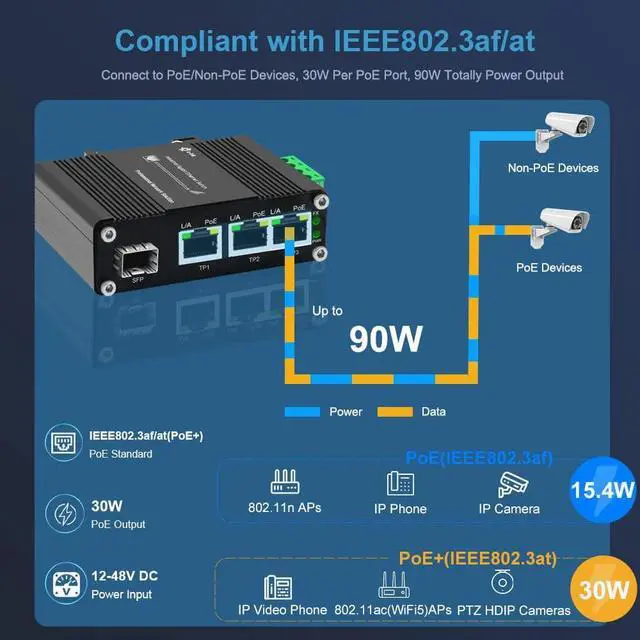 IEEE802.3 10BASE-T, IEEE802.3u 100BASE-TX/FX, IEEE802.3ab 1000BASE-T, IEEE802.3z 1000BASE-X, IEEE802.3ae 10GBase-R, IEEE802.3p QoS, IEEE802.1d Spanning TreeB, IEEE802.3af/at(PoE/PoE+)Forward & Filtering Rate:14880pps (10Mbps), 148800pps (100Mbps), 1488000pps (1000Mbps)Packet Buffer Memory:4MbitsProcessing Type:Store-and-ForwardMax Packet Length:9K Bytes Jumbo FrameAddress Table Size:4K MAC AddressesInterface:3 x RJ45 with 802.3at PoE+ injector function (Ports 1 to 3) + 1 x SFP 1000Base-X or 100Base-FX (auto detection) PoE Standard: IEEE802.3af/at 30WPower Pin Assignment:4/5(+), 7/8(-) PoE Budget:Up to 90W PoE budget (48VDC), 90W PoE budget (24VDC), 60W PoE budget (12VDC) Input Power: 12~48VDC, 4-pin terminal block Power Consumption:<95WOperating Temperature:-40°C to 80°C (-40°F to 176°F)Storage Temperature:-40°C to 85°C (-40°F to 185°F) LNK-IMC103GP