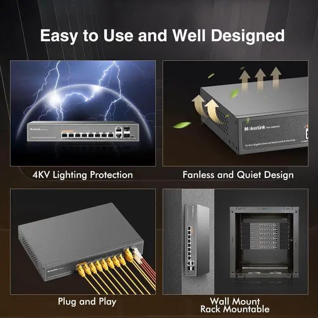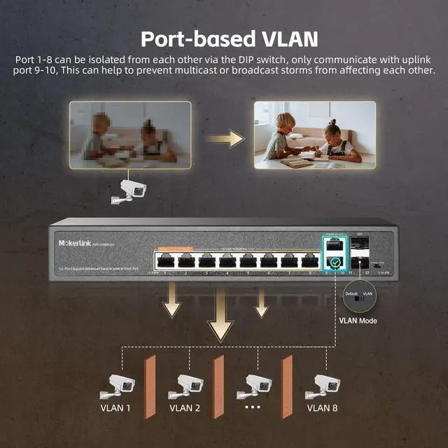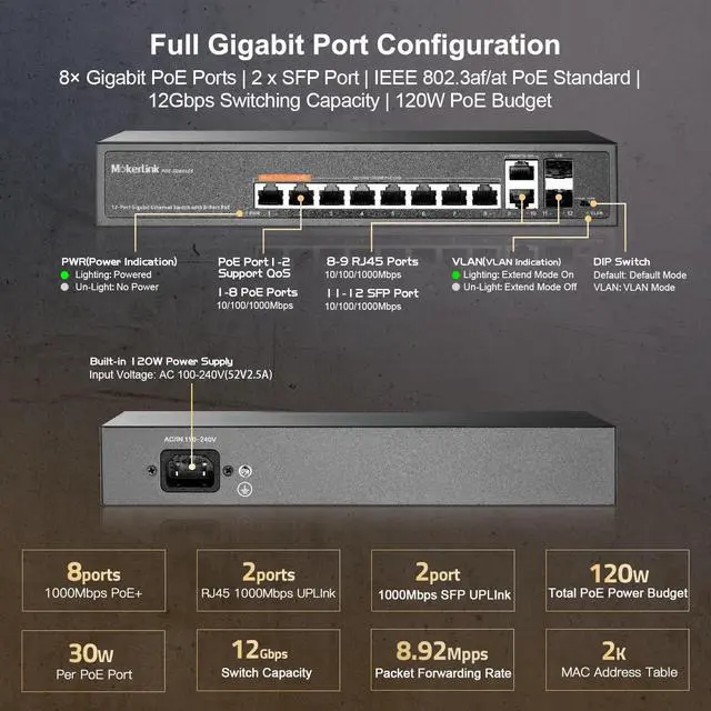 Ports8 x 10/100/1000M PoE Ports + 2x 10/100/1000M RJ45 Uplink Port + 2x 1000M SFP SlotSwitching Capacity / Backplane12GbpsForwarding Rates8.92MppsMAC Address Table2KPoE StandardIEEE 802.3at (PoE+), IEEE 802.3af (PoE), Up to 30W per PortPin AssignmentAlternative A (Pin 1,2/3,6)LED IndicatorsPWR: System Power Status(Green), 1-12 port Link/Act, on: Connected, Off: No connection. VLAN(VLAN Indictor): on: VLAN mode on. off: defult modePower Input100-240V AC, 50-60 Hz, Internal Power Supply, 52V/2.5A, Max. 120WMountingRack-mount / Wall-mount, Metal HousingStructure InformationProduct Dimensions :270*181*44mm, Packaging Dimensions : 350*240*90mm, Product Net Weight: 1.1KG, Product Gross Weight:1.45KGEnvironmentOperating Temperature: -10~55°C, Storage Temperature: -40 °C to 70 °C, Operation Humidity: 10%~90%non condensing, Storage Humidity:5%~95%non condensingExtend FunctionPort-Based VLAN, Hardware QoS, PoE Watchdog This ItemMokerLink 12 Port Gigabit PoE Switch with 8 PoE+ Port, 2 Gigabit Uplink, 2 SFP Port, 120W AI Detection, Qos & Extend, Fanless Metal Plug & Play Unmanaged Network SwitchRecommendationsPOE Gigabit Switch 12 Ports 1000Mbps Switches with 2 uplink & 2 SFP: TEROW 8-Port PoE Ethernet&10-Port Network with 2 SFP Module,120W,802.3af/at Compliant, Plug & Play, Metal Fanless with Shielded MokerLink 11 Port Gigabit PoE Switch with 8 PoE+ Port, 2 Gigabit Uplink, 1 SFP Port, 120W AI Detection, Qos, Fanless Metal Plug & Play Unmanaged Network Switch YuanLey 8 Port Gigabit PoE Switch with 2 Gigabit Uplink, 8 PoE+ Port 1000Mbps, 1 SFP Port, 120W 802.3af/at, Metal, Qos, Unmanaged Plug and Play AI Smart Detection Ethernet Switch 8 Port Gigabit PoE Switch with 2 Gigabit Uplink,802.3af/at Compliant,120W Built-in Power,Unmanaged Metal Plug and Play MokerLink 48 Port PoE Gigabit Switch with 2 Gigabit SFP, 800W IEEE802.3af/at AI Detection, Metal Rackmount Unmanaged Plug and Play Ethernet Switch
