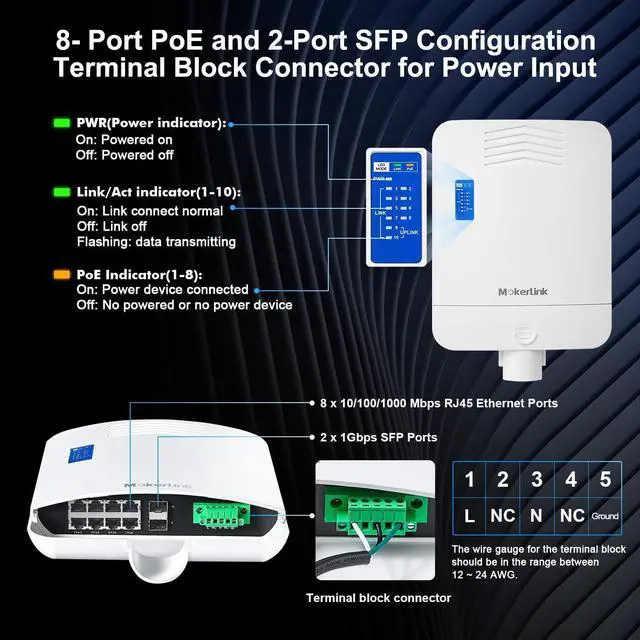ModelPOE-G082GSOEthernet8 x 10/100/1000 Mbps RJ45 Ethernet Ports + 2 x 1Gbps SFP PortsBandwidth20GbpsPack forward rate14.88MppsPacket Buffer Memory2 MbitMAC address4kNetwork ProtocolIEEE802.3 (10Base-T),IEEE802.3u (100Base-TX),IEEE802.3ab (1000Base-TX),IEEE802.3x (Flow control), IEEE 802.3z (Gigabit Ethernet Fiber Standard)PoE ProtocolIEEE802.3af(15.4W),IEEE802.3at(30W)Network Medium10Base-T : Cat3, 4, 5 or above UTP(100m),100Base-TX : Cat5 or above UTP(100m),1000Base-TX : Cat5 or above UTP(100m) Optical MediumMultimode optical fiber: 50/125, 62.5/125, 100/140um,Single-mode optical fiber: 8/125, 8.7/125, 9/125, 10/125umWorking EnvironmentWorking Temperature: -10~50°C, , Storage Temperature: -40~70° C Working Humidity: 10%~90%, non-condensing,Storage Temperature: 5%~90%, non-condensingIndicatorPWR (Power), 1-10 Green Light (Link&Data), PWR On: Powered on, Off: Powered off.1-8 PoE Led On: PoE device connected: Off: No-PoE device/No powerCasingABS plasticStructure SizeProduct Dimensions: 300*220*44mm,Package Dimensions: 500*280*100mm,Product N.W: 0.8kg,Product G.W: 1.36kgPower VoltageInput voltage :AC100-240V,Power supply:52V / 1.85A (96W)Packing ListSwitch 1 PC, Power cord 1 PC, User manual 1 PC This ItemMokerLink Outdoor 10 Port Gigabit PoE Switch, 8 Gigabit PoE, 2 Gigabit SFP, 96W IEEE802.3af/at, IP65 Weatherproof Plug & Play Network SwitchRecommendationsMokerLink Outdoor 6 Port Gigabit PoE Switch, 4 Gigabit PoE, 2 Gigabit SFP, 65W IEEE802.3af/at, IP65 Weatherproof Plug & Play Network Switch MokerLink 8 Port PoE Switch with 2 Gigabit Uplink, 802.3af/at PoE+ 100Mbps, 120W Built-in Power, Extend to 250Meter, Metal Plug & Play PoE Switch with 16 POE Ports +2 Gigabit Uplink,1 x 1.25G SFP,802.3af/at PoE+ 100Mbps, 240W Built-in Power, Extend to 250Meter,Unmanaged Metal Plug and Play Reidubo 8 Port Gigabit PoE Switch Waterproof, 1000 Mbps 8 PoE+ Ports 120W, IEEE802.3af/at Power Over Ethernet Unmanaged Outdoor Network Switch, Plug & Play Gigabit 4-Port PoE Switch/Extender Outdoor IP65 Waterproof PoE Passthrough/PoE Amplifier/PoE Booster,60W 48V 10/100/1000Mbps. IEEE 802.3af/at/bt Compliant,by ThePoEstore