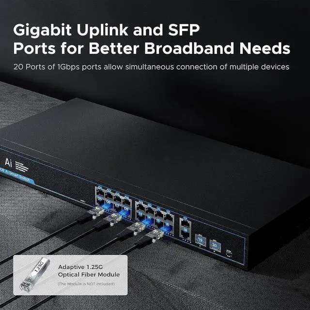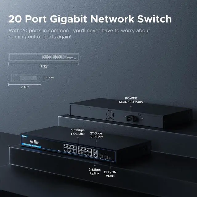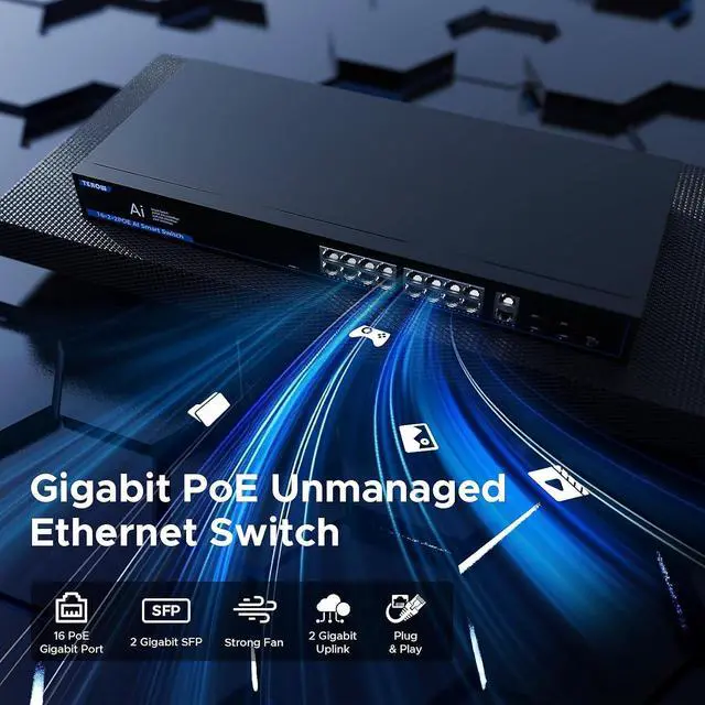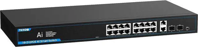 This ItemTEROW 20 Port Gigabit Network Switch with 16 PoE Port & 2 Uplink & 2 SFP Slots - 802.3 af/at Compliant, Plug & Play, Traffic Optimization, Quiet Fanless DesignRecommendationsPOE Gigabit Switch 12 Ports 1000Mbps Switches with 2 uplink & 2