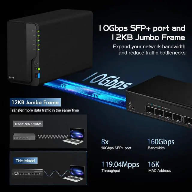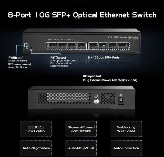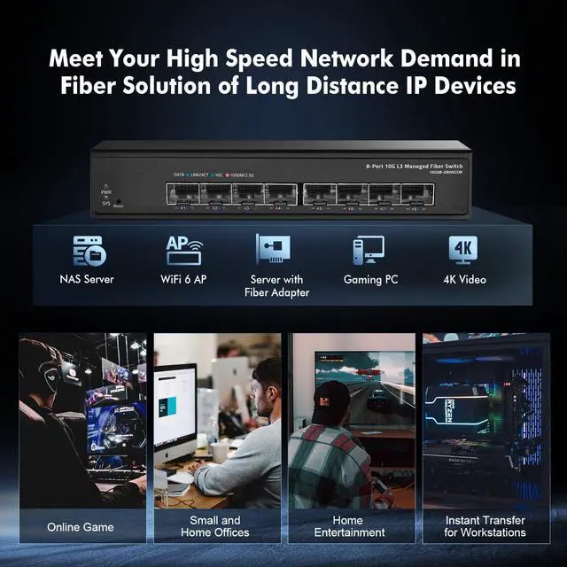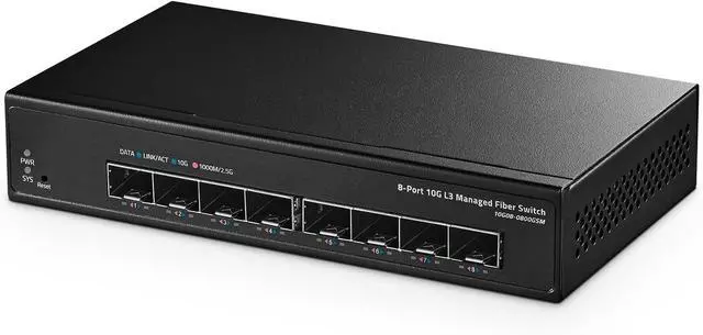 Equipped with a high performance switching engine, the 8-Port 10G Managed Fiber Switch performs optimally. It has low transmission delay, large buffer and is highly reliable.It also has powerful network management functions, supporting IGMP Snooping, Link Aggregation, QoS, LLDP, STP/RSTP,Web