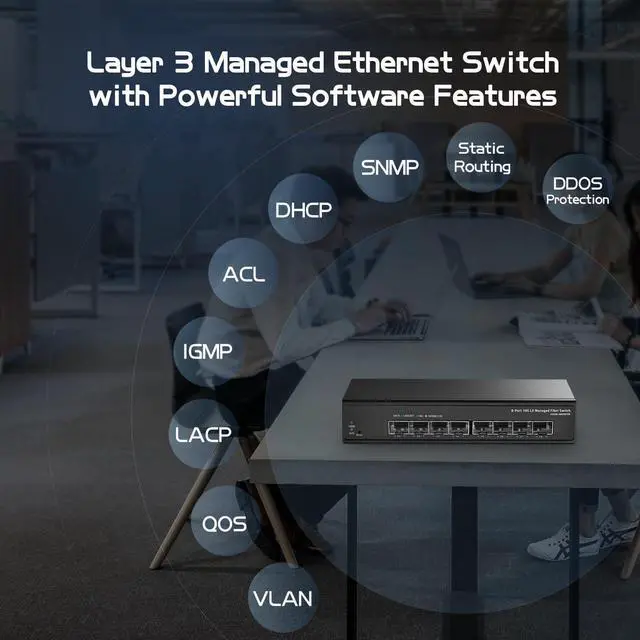 It has powerful L3 network management functions, supporting IGMP Snooping, Link Aggregation, QoS, LLDP, STP/RSTP, Web.
