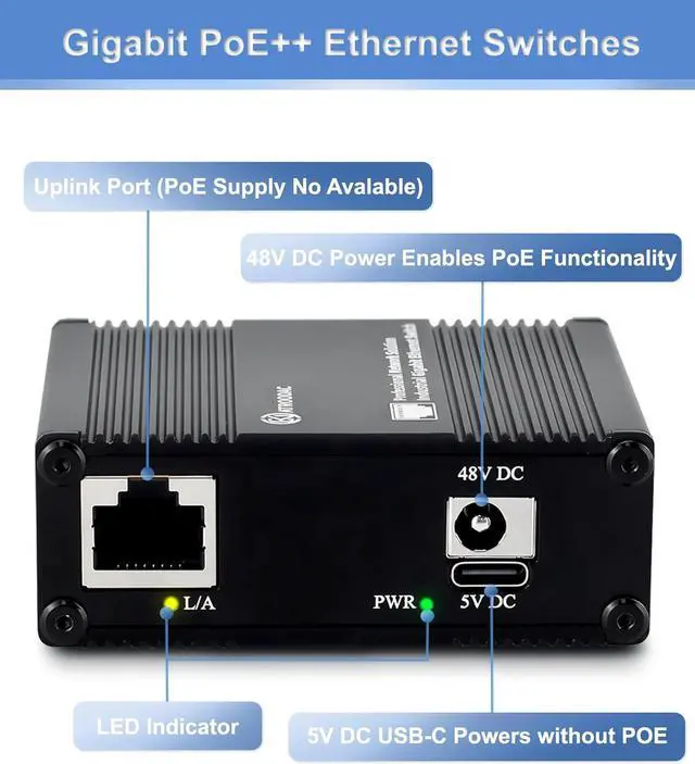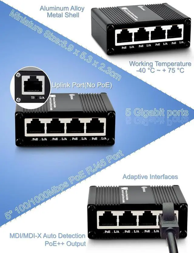 What you get:5-Port 10/100/1000Mbps Desktop Gigabit POE+ Switch supporting Auto Negotiation and MDI/MDIX, PoE+ at port 1-4 up to 30W per port.
