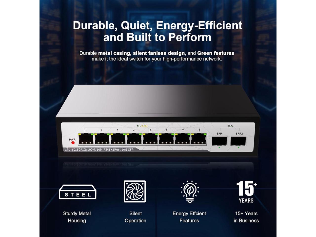 10-Port 2.5Gb Unmanaged Ethernet Switch, 8 x 2.5G RJ45 Ports + 2 x 10G SFP+ Ports, 80Gbps Switching Capacity, Metal Fanless, Plug and Play, Ideal for NAS, PC, WiFi6, Desktop/Wall Mount