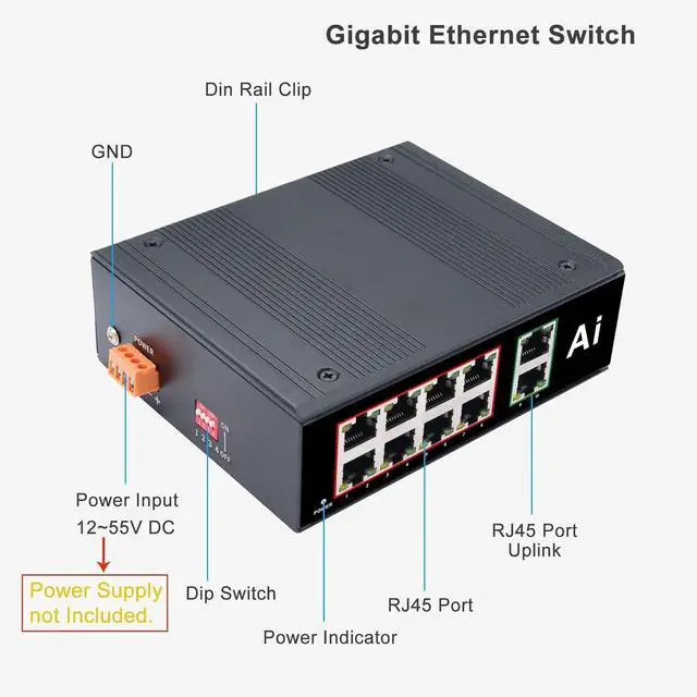 Ethernet Port8xRJ45Rate10/100/1000MbpsOperating modeStore and forwardUplink2xRJ45 or 2xSFPPoE StandardIEEE802.3 af/at PoE Pin12+, 36-Power Input12~55V DC (Power adapter not included)Operating temperature-40°C to 80°C (-40°F to 176°F) Industrial 10 Ports Gigabit Ethernet Switch 8 Port RJ45 PoE Network Switch Outdoor Din Rail PoE Ethernet Switch THe 10 Ports Din-rail Mount Ethernet Switch Come with 4P Dip Switch for Advanced Function, Suitable for More Application Scenarios. Dip Switch 1: LPP&BSP Dip Switch 2: Port 1 Extension Dip Switch 3: Port Isolation Dip Switch 4: AI Watchdog The 8+2 Switch is Industrial Grade Quality, suitable for harsh environment application. Industrial Etehrnet Switch Specifications: