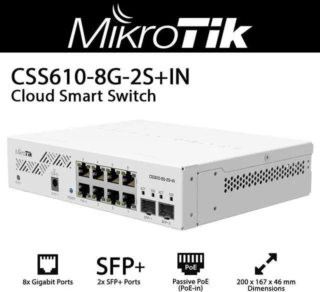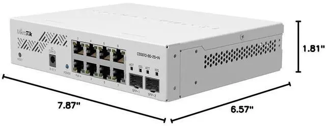 Cloud Smart Switch 610-8G-2S+IN is our answer to the everlasting demand for more power in a small and simple package. It comes with the lightweight SwOS which is easy to configure from your web browser. It gives you all the basic functionality for a managed switch, and more: you can manage port-to-port forwarding, broadcast storm control, apply MAC filters, configure VLANs, mirror traffic, apply bandwidth limitation and even adjust some MAC and IP header fields.