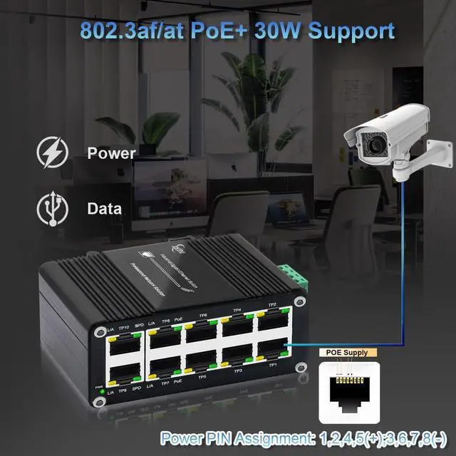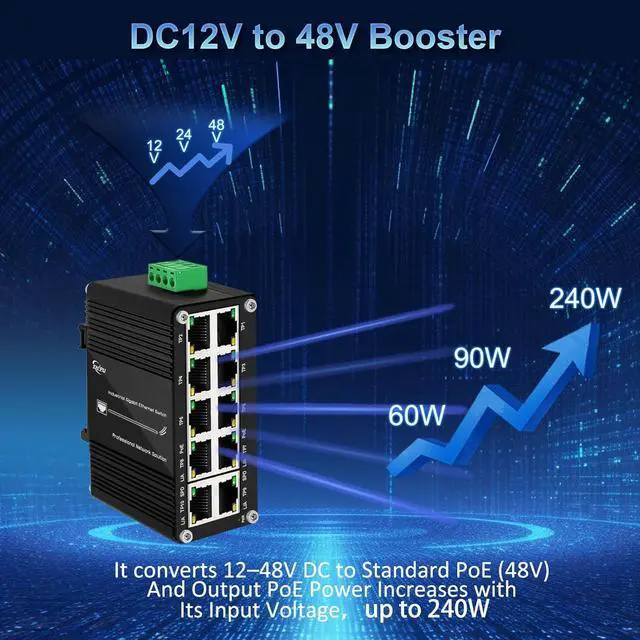 The Industrial Ethernet Switch is Gigabit PoE 8 Port PoE Switch with DC12V to 48V Voltage Booster. It also supports IEEE 802.3af/at, Auto-negotiation, full Duplex or half Duplex, Auto-negotiation. With its reliable design and ease of use, the product is a great choice for you to transfer data and information quickly and supply poe power to connected devices.