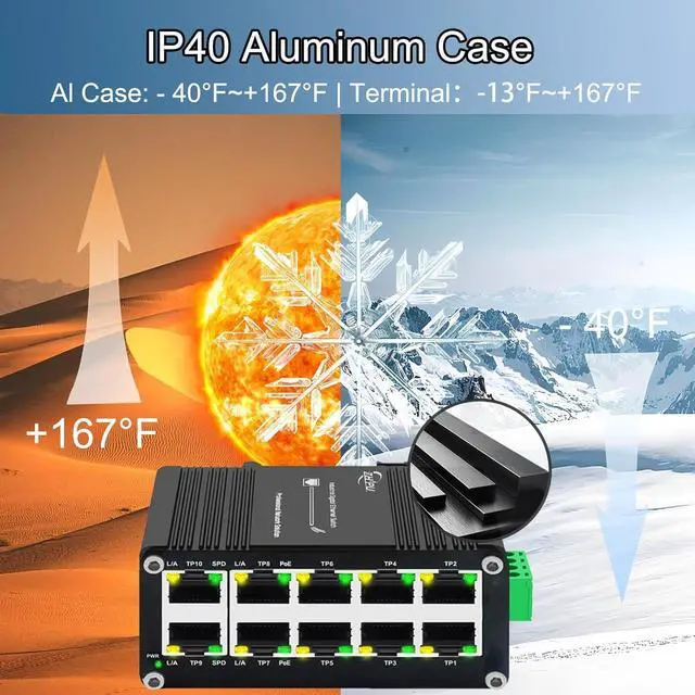 IP40 Aluminum Case and Supports DIN-Rail installation; -40°C to 80°C (-40°F to 176°F) operating temperature