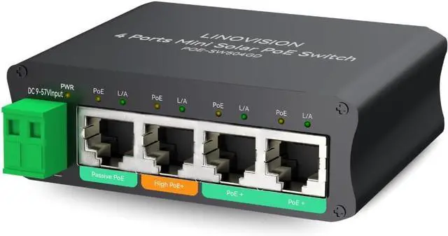 LINOVISION 4 Ports Mini Solar PoE Switch Works Directly with DC12V or DC24V Batteries, Provide 2 PoE+ Ports, 1 High PoE+ Port for Big PTZ Cameras and 1 Passive 24V PoE Port for Wireless Bridge