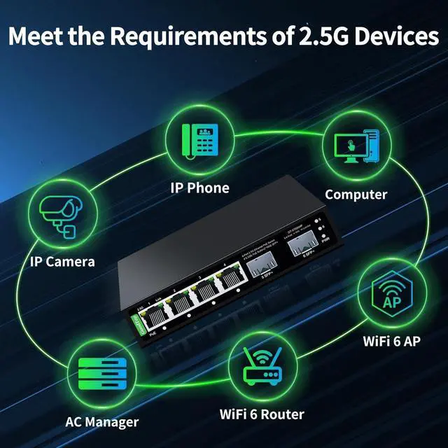 6 Port 2.5G Ethernet PoE Switch equipped with 4 x 2.5G RJ45 PoE ports and 2 x 10G SFP. It provides 60Gbps full duplex backplane capacity. All ports support wire-speed forwarding for your devices and allowing you to easily upgrade your network