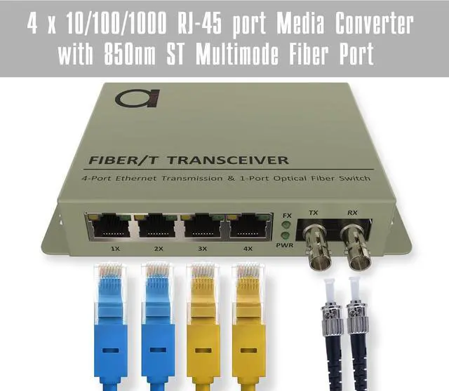 4 x RJ-45 ports AUTOMATICALLY adapts to 10 Mbit/s, 100 Mbit/s (Fast Ethernet) or 1000 Mbit/s (Gigabit) Speed And Extends Ethernet over Multimode ST 850nm Fiber Pair