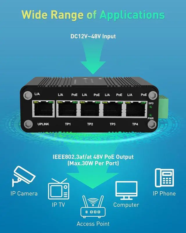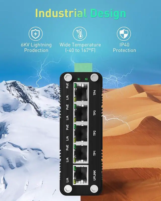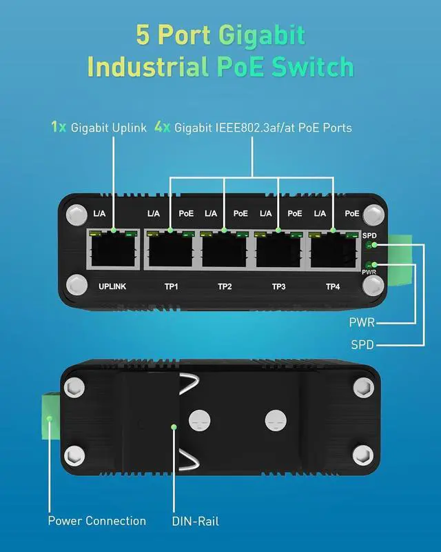 Industrial 5 Port Gigabit Ethernet Switch, Unmanaged PoE Switch, IP40 Ethernet Splitter, Wall-Mount & DIN-Rail Installation (Power Supply Excluded)