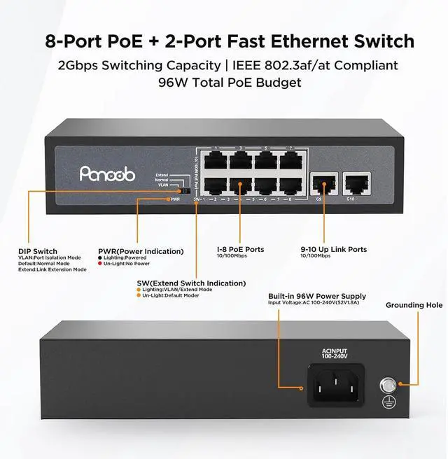 needs. Supporting AC100-240V wide voltage input, it features 2 Gigabit uplink RJ45 ports for efficient network device connectivity. Compliant with 802.3af/at PoE standards, it delivers up to 30W per port, perfectly supporting 4K/8MP/5MP PoE IP security cameras and other PoE devices, simplifying cabling and reducing installation costs. Built with a metal housing, it offers excellent heat dissipation and durability, making it suitable for various environments. With plug-and-play functionality, no complicated setup is required, ensuring easy installation. Equipped with lightning protection, it safeguards devices from voltage fluctuations and surges, ensuring stable network performance. Whether for home security, small business surveillance, or network expansion, this switch is your ideal solution!