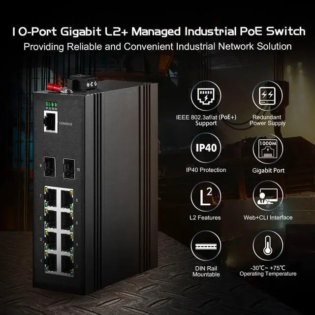Industrial IP40This is a industrial grade switch, using sturdy aluminum alloy casing and industrial grade electronic components, working temperature -40~75°C(-40~185°F), anti-lightning, anti-static and anti-overload protection. Support 2-way industrial grade power interface input, automatically switchover when 1-way fails without any downtime, high reliability ensures continuous business operation.