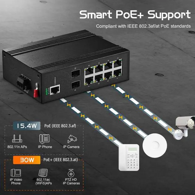 IEEE802.3af/at PoEThe poe ports 1-8 support IEEE802.3af/at standard, max power 30W per port, can connect multiple poe devices, such as POE camera, poe ap, etc. Please note that passive 24v poe is not supported. POE input DC voltage is 48-55V, so please use more than 48V input voltage to provide POE. **Deault without power supply**