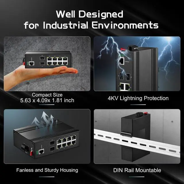 Widely UsedBoth the power supply and the port have LED indicators, which can clearly observe the running status of the device. Fanless design, heat sink for heat dissipation, quieter and energy saving during operation. Din-rail & Wall mount kit, easy to install, powerful management capabilities, suitable for professional networks such as industrial control, computer room, warehouse, factory, compact control box